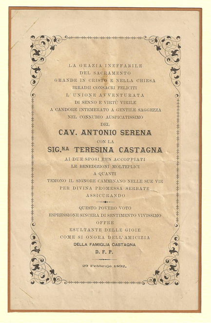 Luigi Serena nasce a Signoressa di Trevignano l’8 settembre 1806, da Angelo e Maddalena Perin. Trasferitosi più tardi a Cornuda per svolgervi il lavoro di daziere, trova alloggio presso la locanda “Stella d’Oro” dove conosce Anna Pizzolotto, figlia di uno dei proprietari della locanda e dell’omonimo rinomato “Liquorificio di Cornuda” (“Sior Antonio Pizzolotto- Fabbricier e Deputato”, inventore del liquore “Curaçao”) che diventerà sua moglie.